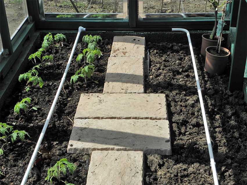 - Сеть труб прокладывается у стены теплицы, поперек грядок, в обе стороны через тройник.