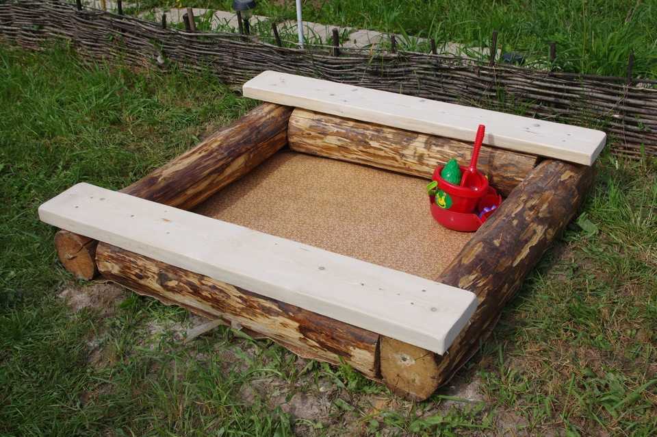 Из бревен можно сделать и ограду для песочницы традиционного типа. На грунт положить основание: кусок линолеума, например, в котором сделать несколько дырок — для стока воды после дождя. На основание положить бревна, сделав из них прямоугольник/квадрат. Скрепить их можно длинными гвоздями, но надежнее шпильками — стальными стержнями с резьбой на обоих концах. Под них надо будет в месте соединения бревен наискосок просверлить отверстие. Диаметр — чуть больше диаметра шпильки. Края отверстия рассверлить — чтобы можно было утопить гайки с шайбами. В отверстие вставить стержень, с обоих концов надеть шайбы, затянуть все гайками.