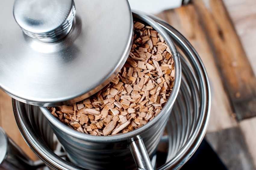 Вначале нужно загрузить в конструкцию щепу. Количество топлива может быть разным. Как правило, его суммарный вес составляет около 0,7-0,8 кг. Важный момент заключается в выборе породы дерева, применяемого для получения дыма, необходимого для копчения. Категорически нельзя использовать хвойные деревья, так как они при нагреве выделяют смолы, которые испортят продукты, загруженные в коптильный аппарат. Для копчения рекомендуется подбирать дрова и опилки, изготовленные из лиственных и фруктовых пород деревьев (например, дуб, клен или яблоня).