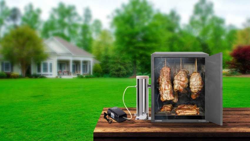 Прогресс не стоит на месте. Все чаще дымарню делают компактной, при этом не уступающей по функциональности стационарной. Для этого понадобится дымогенератор, сделанный из нагнетателя воздуха. При этом отпадает необходимость прокладывать длинный дымоход. В мобильном устройстве дым из сопла уже имеет необходимую для холодного копчения температуру.