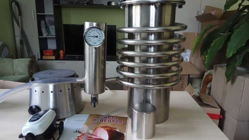 Воздух, нагнетаемый компрессором, направляет дым в дымоход, а оттуда – в резервуар с обрабатываемым продуктом.