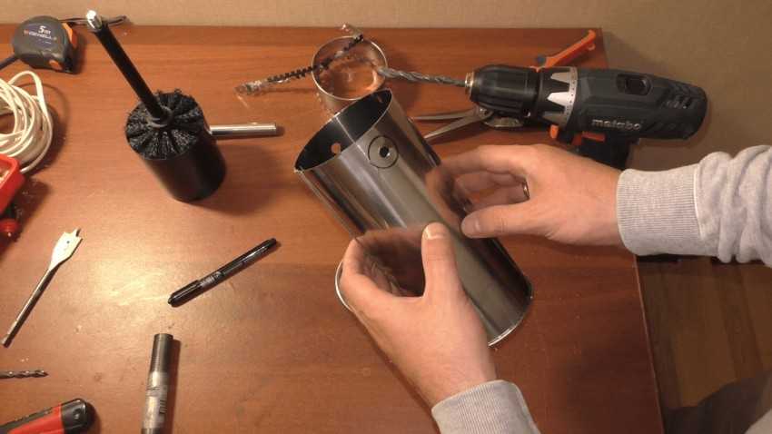 - В верхней части конструкции, примерно на 7-9 сантиметров ниже верхнего края используемой трубы, делается еще одно отверстие. С его помощью к дымогенератору будет крепиться трубка дымоотвода.