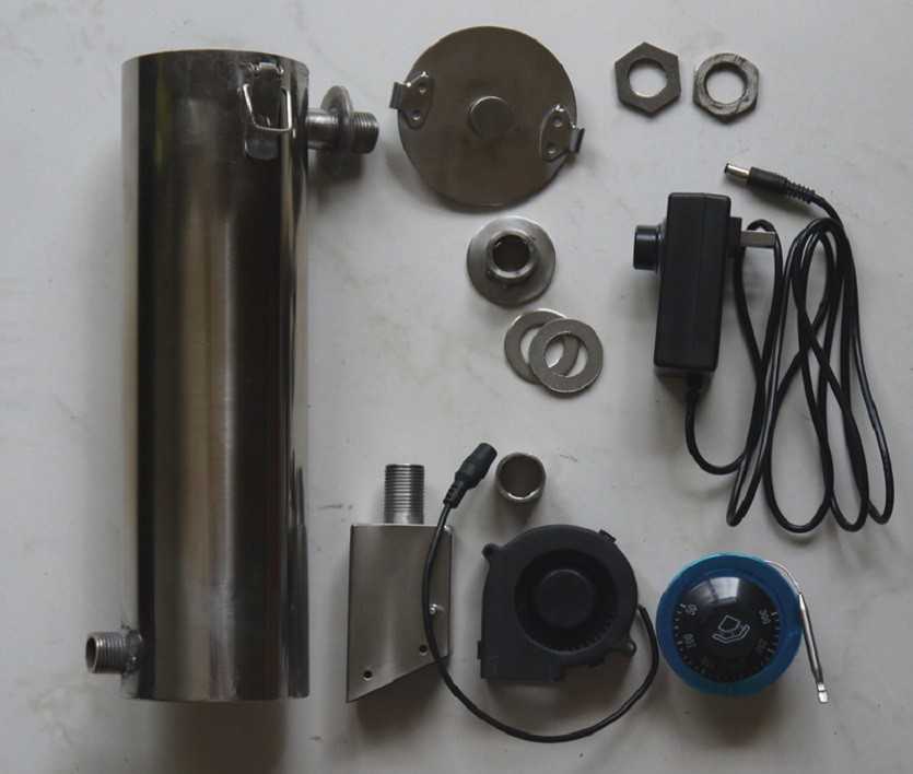 Самое хитрое расположение у тонкой трубы. Сквозь штуцер, внутрь корпуса, она должна заходить на 1 сантиметр в трёхчетвертной отвод. Эта конструкция будет подавать воздух из компрессора и обеспечивать тягу, поддерживающую тление опилок. Для обустройства циркуляции дыма и воздуха в плотно набитом опилками корпусе на неё нужно одеть пружину большего диаметра. Это такой своеобразный рыхлитель, через витки которого и будут проходить потоки воздуха.