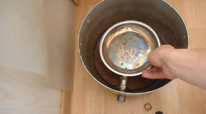 Горения древесины можно избежать, не допуская ее прямого контакта с огнем. Для этого первое ведро, где генерируется дым, ставят на огонь. Дно нагревается, щепа начинает тлеть и выделять дым, но так и не загорается.