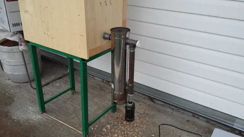 - В наиболее простых вариантах генератора, щепа насыпается на дно устройства, которое приваривается наглухо к краю трубы. В этом случае для очищения конструкцию переворачивают. Зольник в таком самодельном дымогенераторе не предусмотрен.