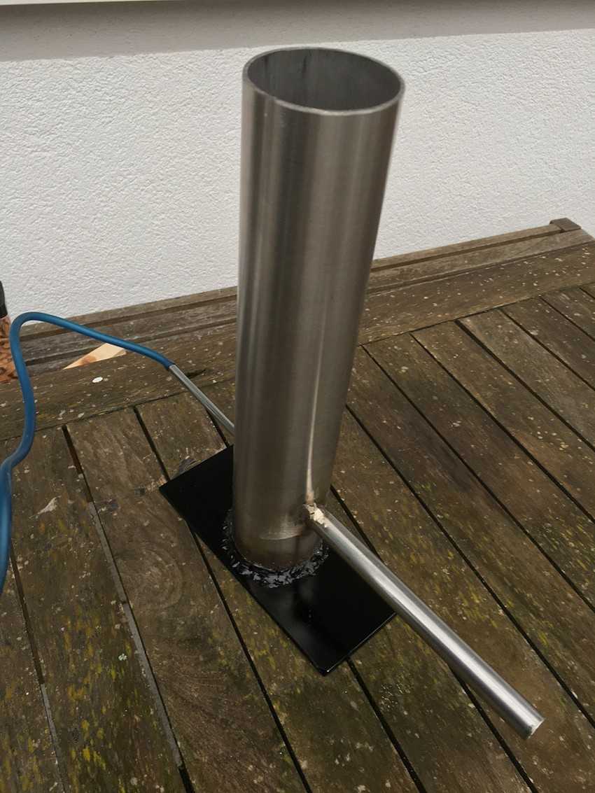 - Теперь ввариваем дымоотвод сверху основы, отступая 50 – 80 мм от среза.