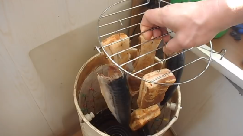 - на размещенные во втором ведре шампуры укладывают мясо или рыбу для копчения, закрывают крышкой;