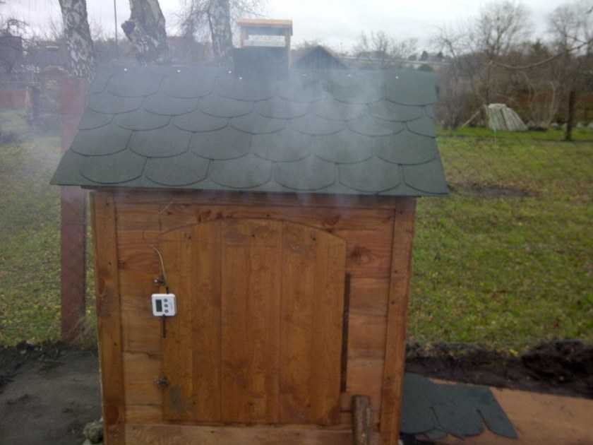 Самый лучший вариант – устанавливать коптильню под навесом, тогда ни снег, ни дождь не будут оказывать существенного влияния на процесс приготовления.