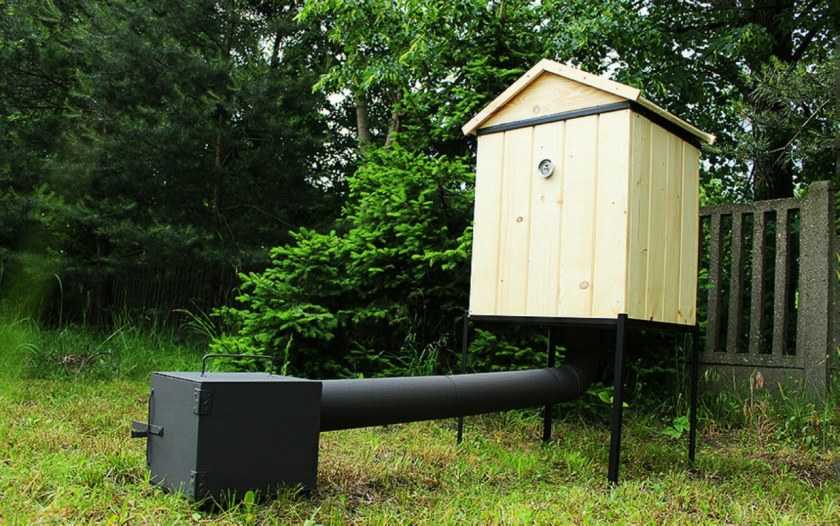 Более простым вариантом является установка коптильни на склоне холма и использование в качестве генератора дыма костра или небольшого очага. Дымоход изготавливается из канавы, выкопанной в земле, и накрытой шифером или листами металла.