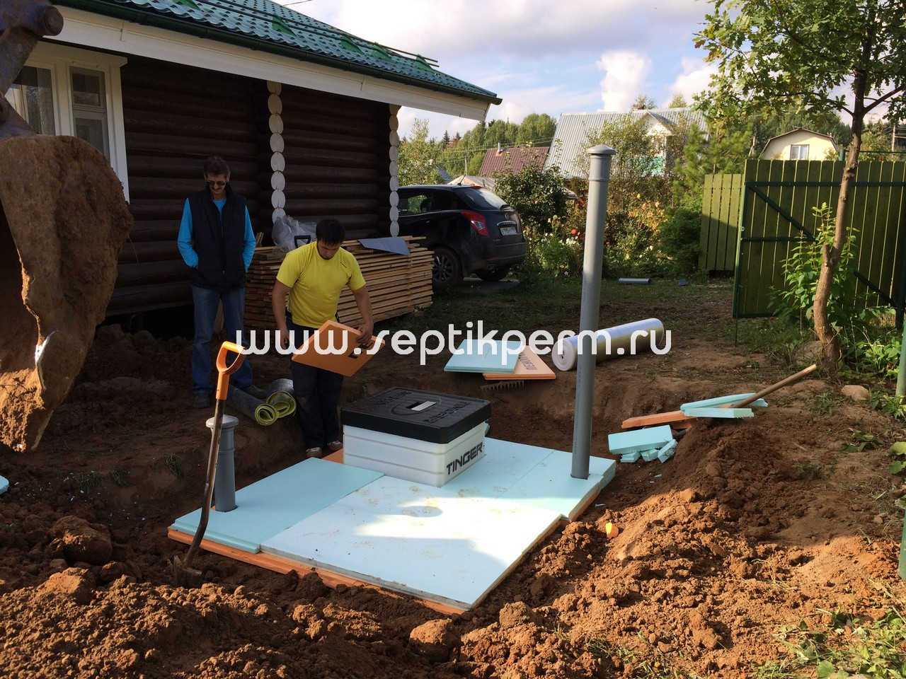 - Утепление верха. Желательно уложить утеплитель не только над емкостью, но и захватив в стороны 1-1,5 метра. Это гарантия того, что на крыше не будет оседать иней зимой и не будет конденсироваться влага летом. Утеплитель — экструдированный пенополистирол толщиной 50 мм. Укладывать в два слоя с разбежкой швов.
