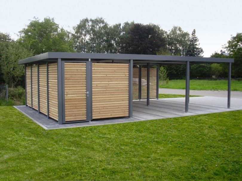 Хозяйственное помещение, построенное модульным способом, состоит из металлических или пластиковых готовых модулей. Применяются специальные крепежные детали для соединения между собой строительных элементов. Главная особенность — мобильность сооружения, так как в будущем его можно будет разобрать и переместить.