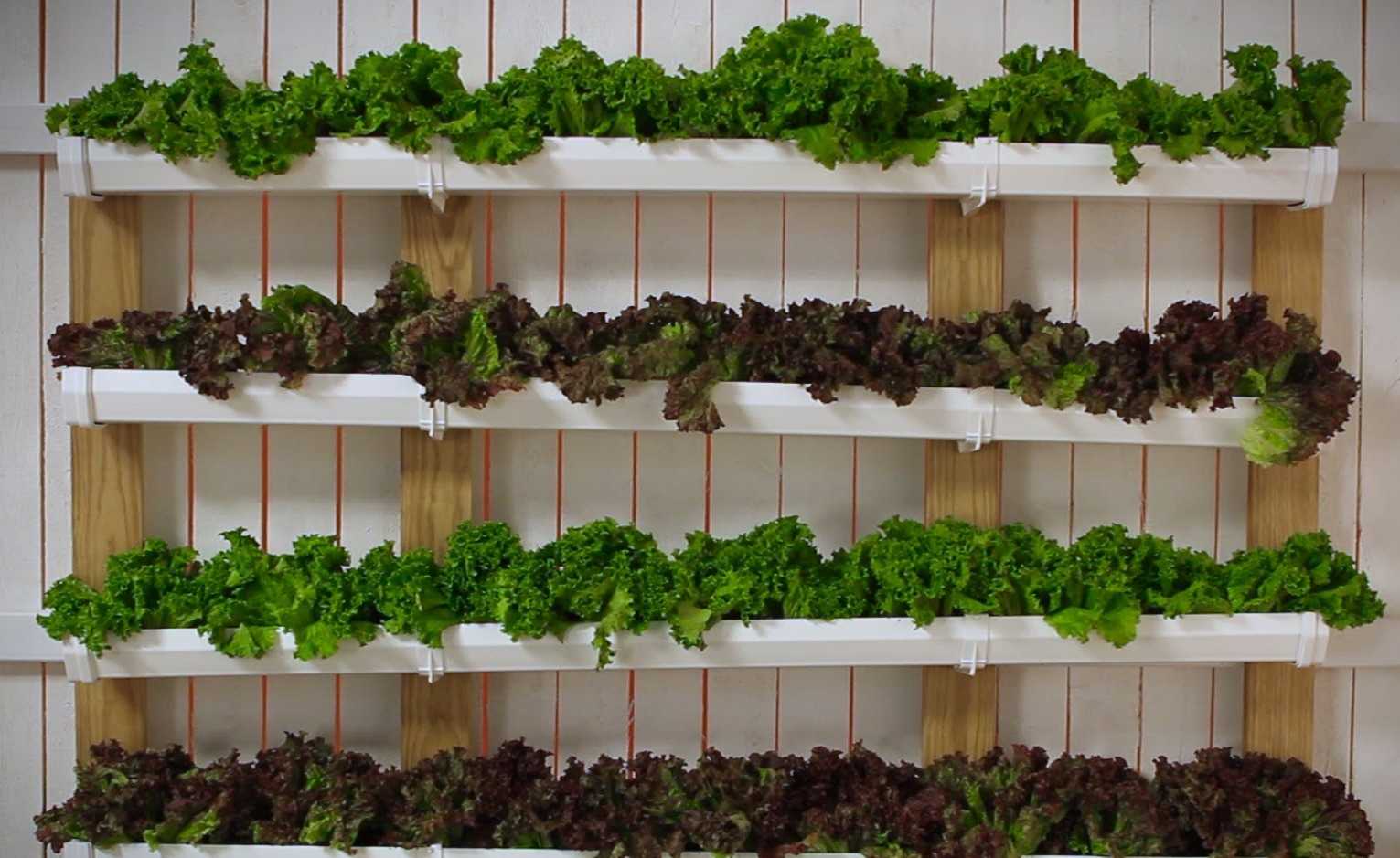 Неглубокие вертикальные грядки для зелени можно сделать и из разрезанных по горизонтали труб. Их подвешивают на веревках или расставляют на полках.