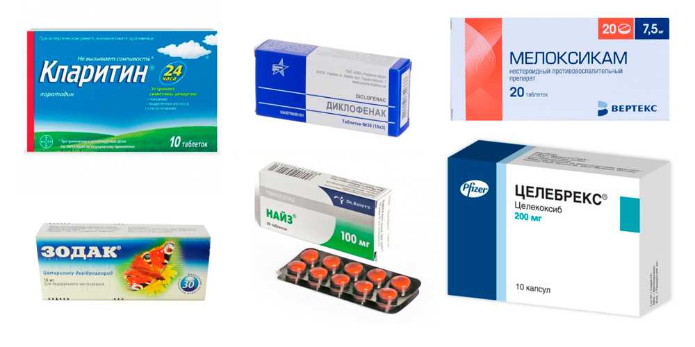 При обострении заболевания можно принять противовоспалительные средства Найз, Диклофенак, Мелоксикам, Целебрекс, а также антигистаминное средство Кларитин или Зодак