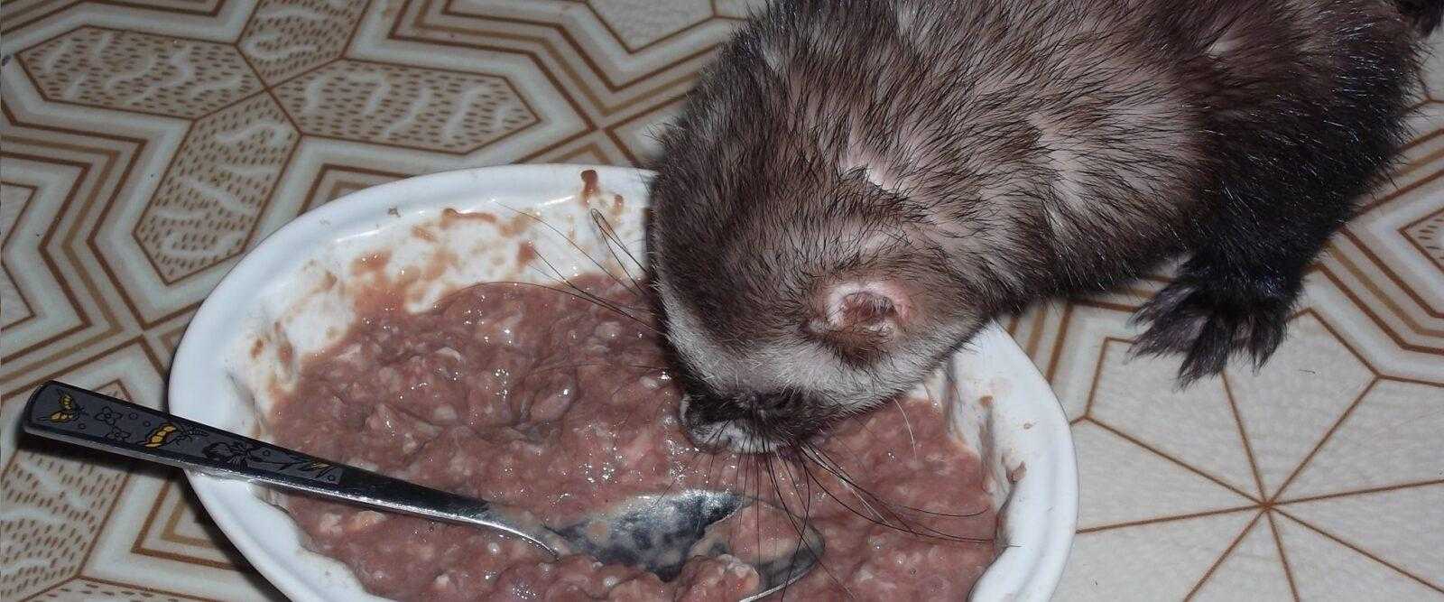 К самому распространенному и удобному виду питания хорей дома относится фаршекаша. Эта пища обладает достаточным энергетическим запасом, содержит в составе необходимые питательные вещества, да и фретка ест ее очень хорошо.