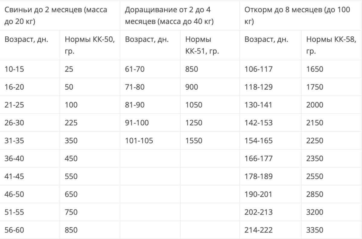 Питание поросят меняется постепенно, с первых дней до начала откорма. На каждом этапе требования к корму меняются. В таблице представлены базовые показатели рахода комбикорма для откорма. В среднем поросята откармливаются 1,5-3 месяца.