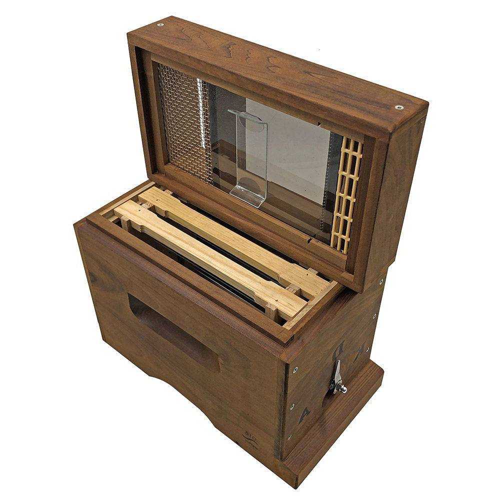 В этот пчелиный домик устанавливается 1 рамка с запечатанным расплодом и 2 рамки с кормами, а также закладывается около 300 рабочих пчел и дозревающий маточник.