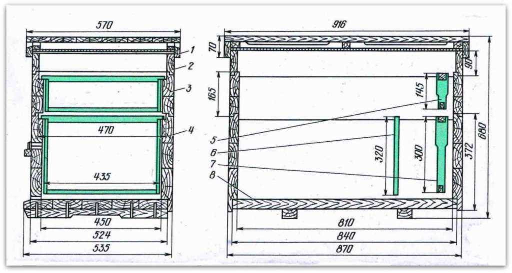 Деревянные стенки основного улья не должны быть тоньше 32 мм. При изготовлении магазина рекомендуют пользоваться менее тонкой древесиной (до 26 мм).