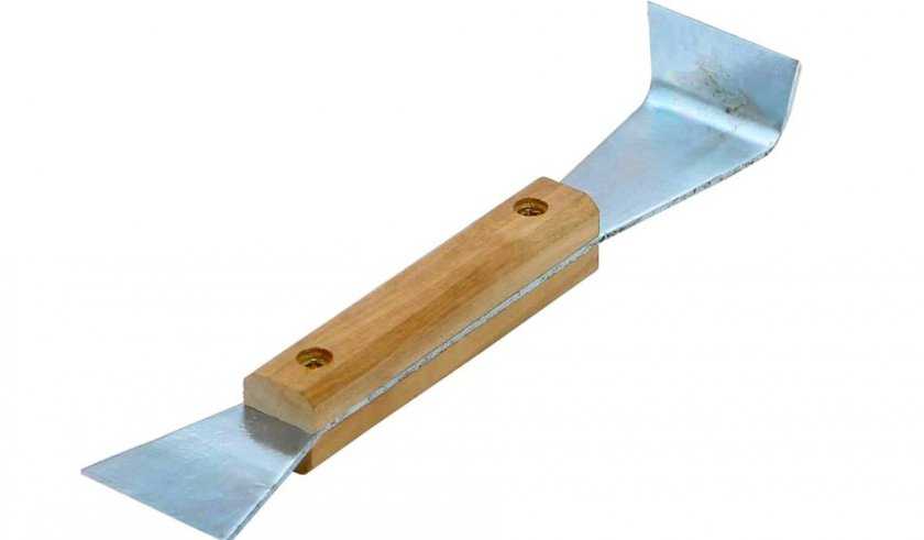 Первый инструмент выглядит, как буква «Г» в верхней рабочей части и расширяющаяся в нижней части, как строительный шпатель.