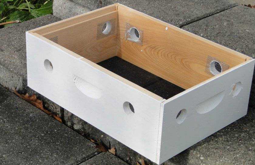 Леток, расположенный вверху, может иметь размеры 20×10 мм. По бокам строения высверливают несколько отверстий диаметром не более 15 мм. Отверстия обычно снабжают решётчатым материалом.