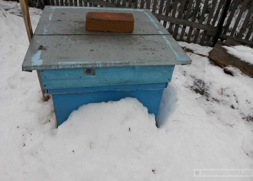 Когда выпадет достаточное количество снега, улей покрывают снежным «одеялом» толщиной 30-70 см. Снег – плохой проводник тепла, поэтому станет хорошим утеплителем. Под снежной «подушкой» установится температура близкая к 0°C. Вокруг пчелиного дома образуется прослойка воздуха в 3-5 см. Ледяную корку, появляющуюся при оттепели, аккуратно разрыхляют.
