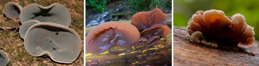 Розоватые, красные, коричневые, бардовые, бурые и даже черные плоды этой разновидности, произрастающие по отдельности или кучными группами и формирующие непонятные студенистые образования, можно увидеть преимущественно на древесных стволах. И если одни грибки действительно напоминают по своей форме ушную раковину, то другие похожи на воронки или выпуклые полусферы, сплошь покрытые мелким ворсом, придающим поверхности шляпки легкий бархатистый эффект.