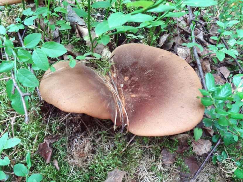 На фото свинушки можно спутать с груздями. Они имеют большие шляпки — до 17 см в диаметре, которые вогнуты внутрь. По краям шляпка завёрнута. У молодых грибов она бурого цвета, а у более старших сероватая.