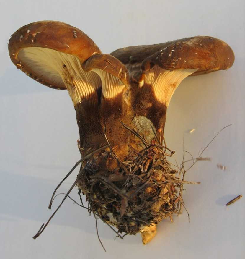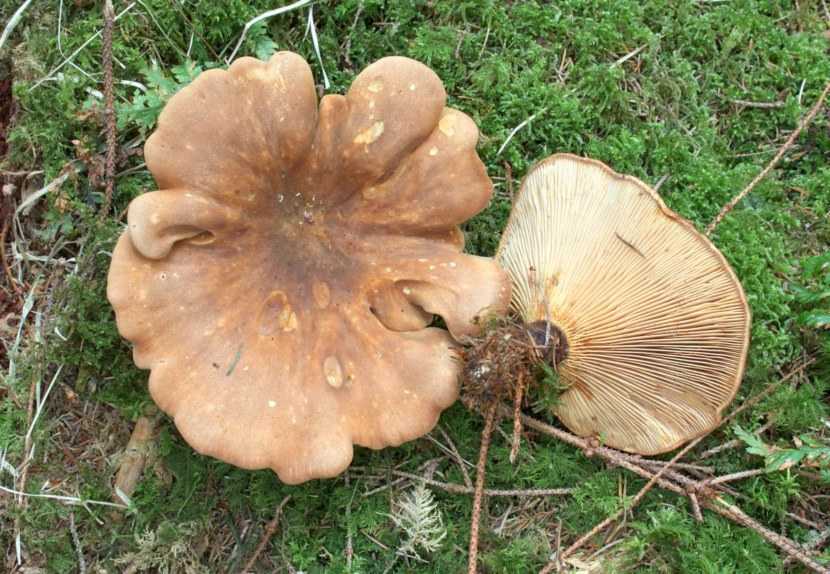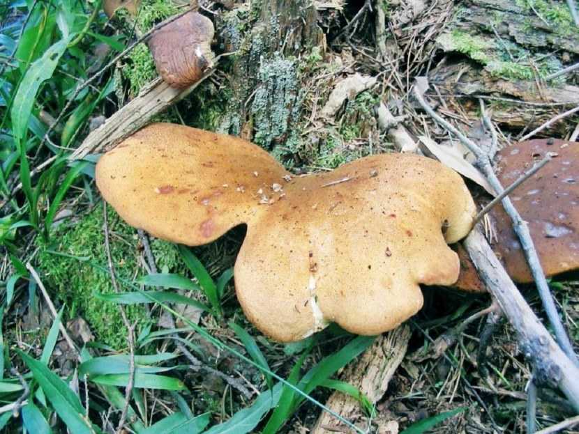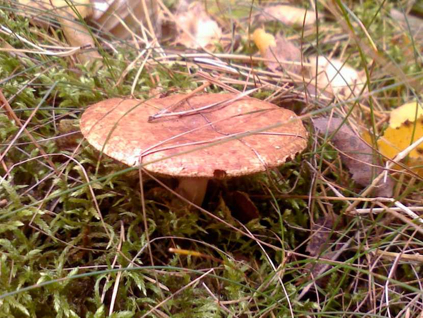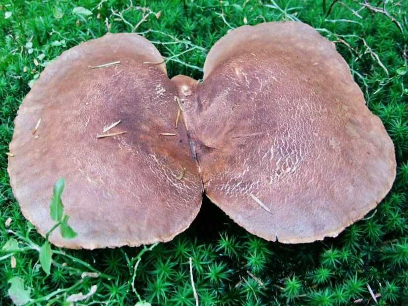 - Бурой. Похожи по облику и окраске. Отличают по аромату: подлинник имеет запах грибов, поганка – натурального мыла. Кроме того, бурые особи имеют отличительные дымчатые пятна на верхушке.