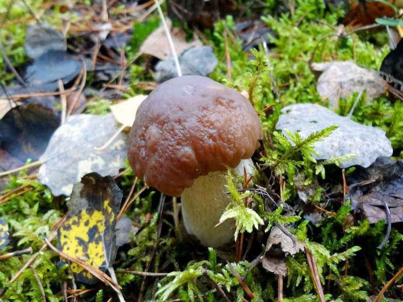 Боровик, или белый гриб, имеет множество названий: белевик, медвежник, глухарь — и относится к числу съедобных. У него довольно мощная ножка, шляпка выпуклая, но по мере роста становится более плоской, в размере может достигать до нескольких десятков сантиметров. При благоприятной погоде имеет гладкую поверхность, однако в более сухой период может быть слегка морщинистой и потрескавшейся, при повышенной влажности блестящая, покрытая небольшим слоем слизи. Мякоть плотная, от светлого до слегка желтоватого цвета.