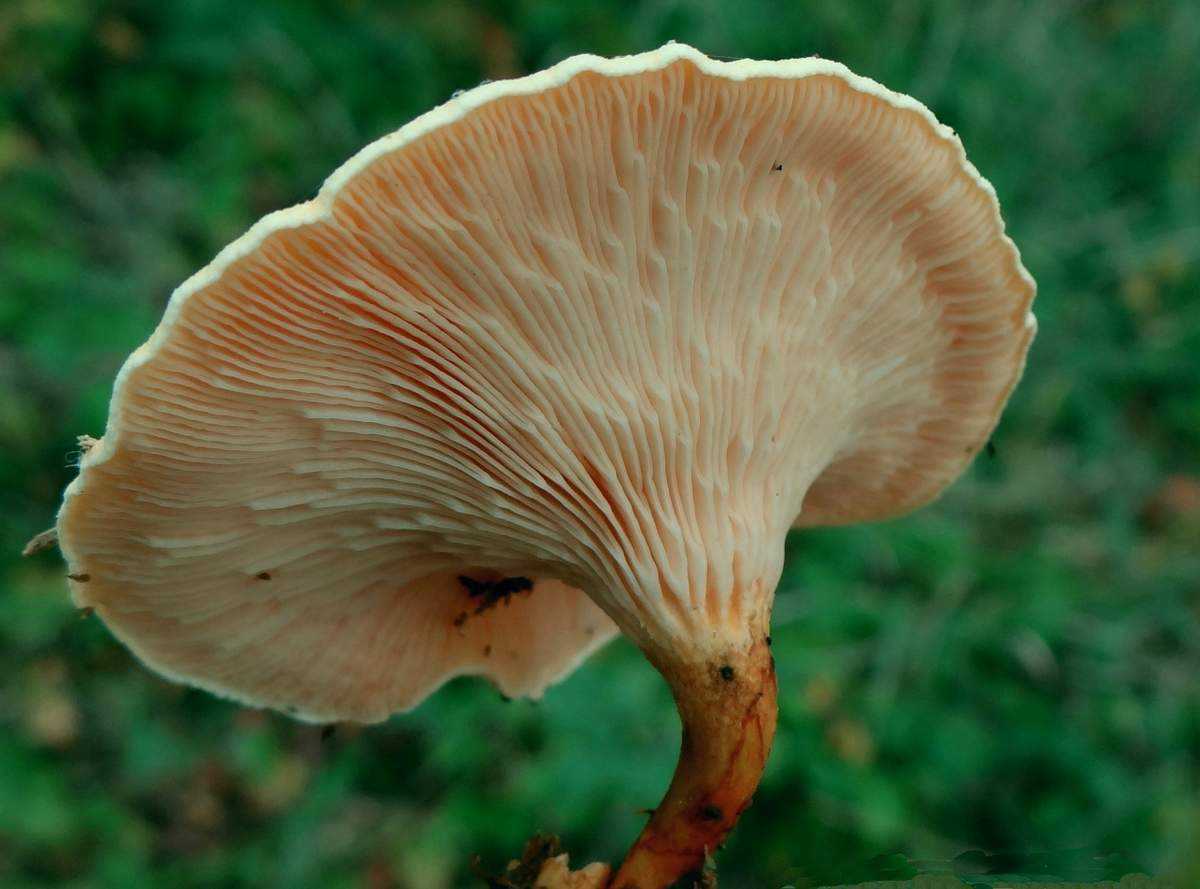 Пластинки у ложных лисичек тонкие, часто расположенные, не переходящие на ножку, ветвящиеся, оранжевого окраса. А у настоящих лисичек пластинки плотнее, они спускаются на ножку.