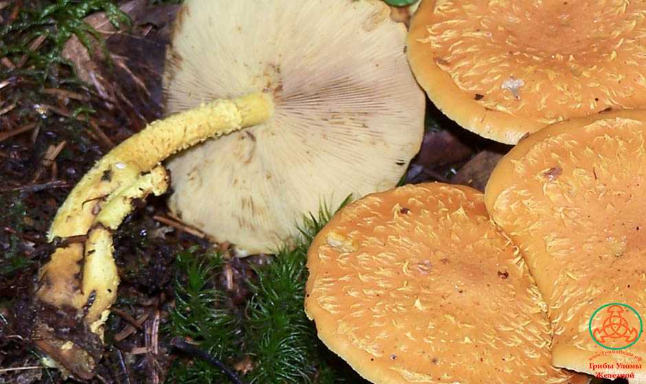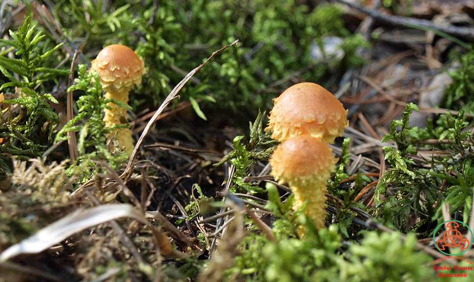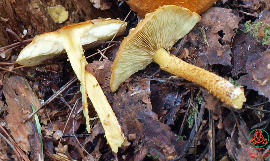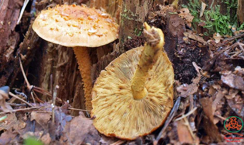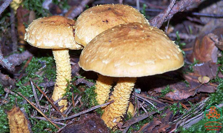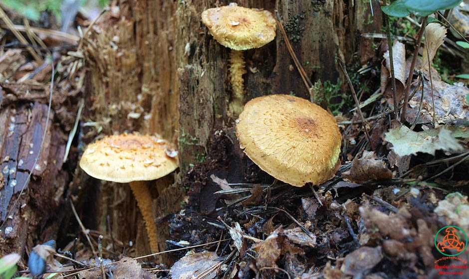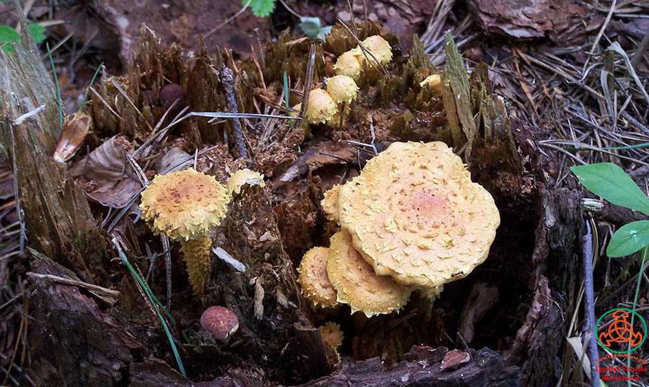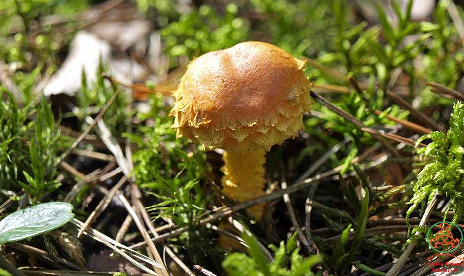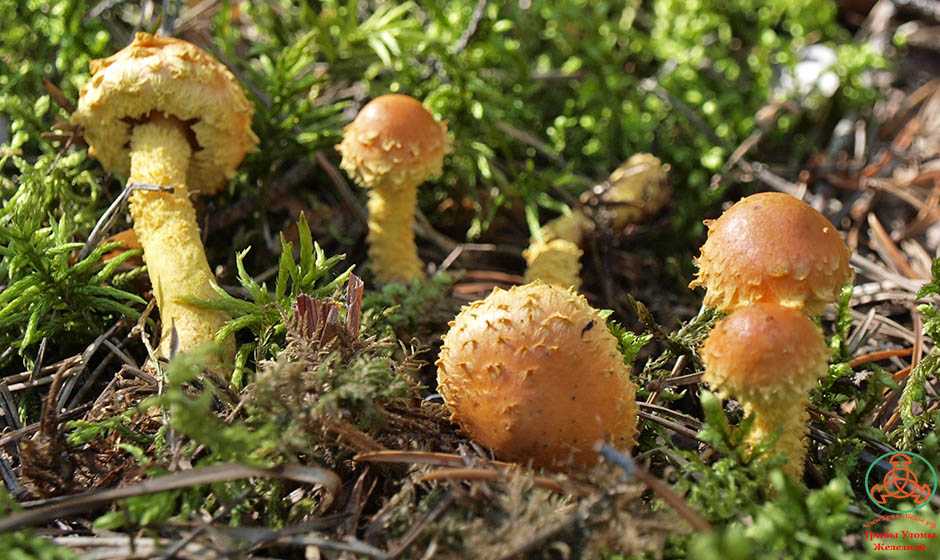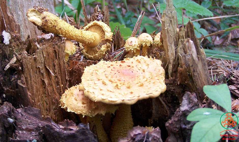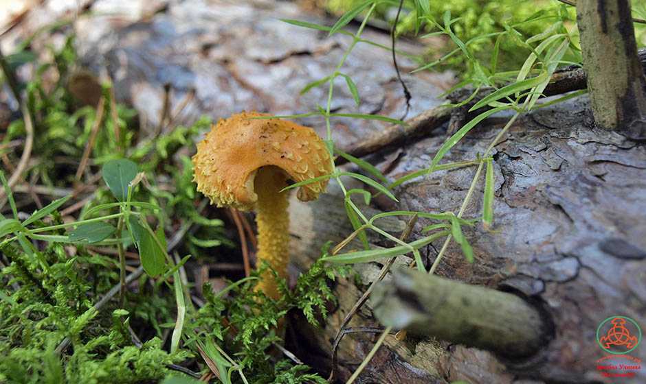 Чешуйчатка огненная вся окрашена в ярко-жёлтые цвета. Это, наверное, самая “чешуйчатая” из чешуйчаток – на её шляпке и ножке видны многочисленные шипики-чешуйки.