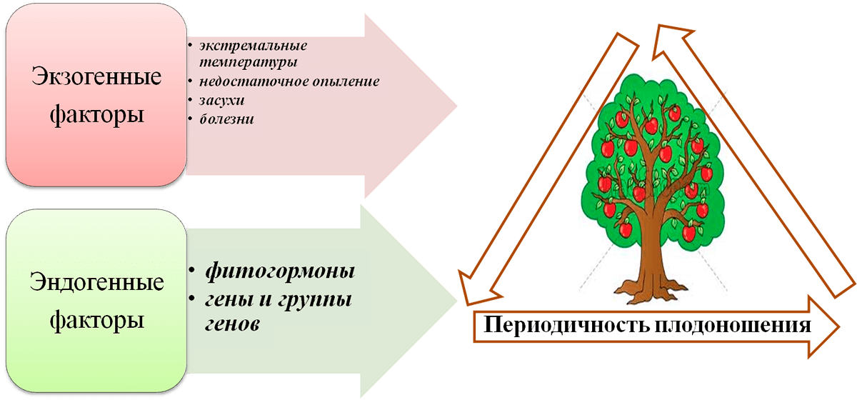 Для установления причин периодичности плодоношения необходимо выявить специфические взаимосвязи между развитием плодов текущего года, инициацией цветочных почек следующего года и вегетативным ростом обоих лет, что представляет собой большую сложность. Отдельные причины, порождающие периодичность, разделяют на две группы: экзогенные (внешние) и эндогенные (внутренние) (рис. 1). Экзогенные факторы (мороз, недостаточное опыление, засуха, болезни) обычно начинают цикл периодичности, резко сокращения урожай текущего года. Дальнейшее сохранение цикличного поведения происходит благодаря эндогенным (гормональным, биохимическим и молекулярным) факторам.
