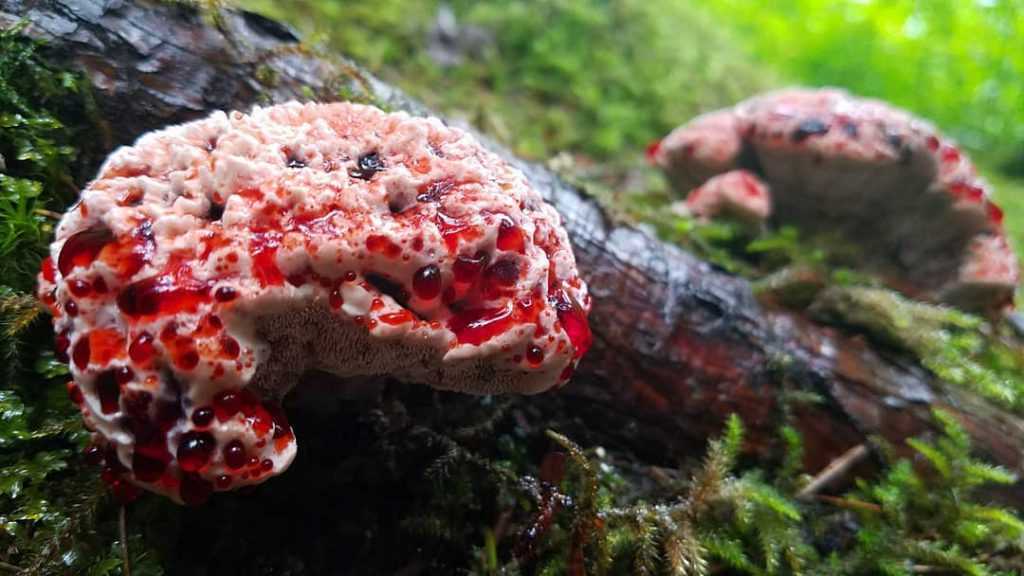 - Из многочисленных пор выступает кроваво-красная жидкость. Внешне может показаться, что гриб обрызган клубничным сиропом. Кстати, эту иллюзию усиливает приятный ягодный аромат, источаемый грибом. Хотя многие ассоциируют эти капли с капельками крови, а белое тело гриба очень сильно напоминает зуб, отсюда и появилось негласное название – Кровавый Зуб.