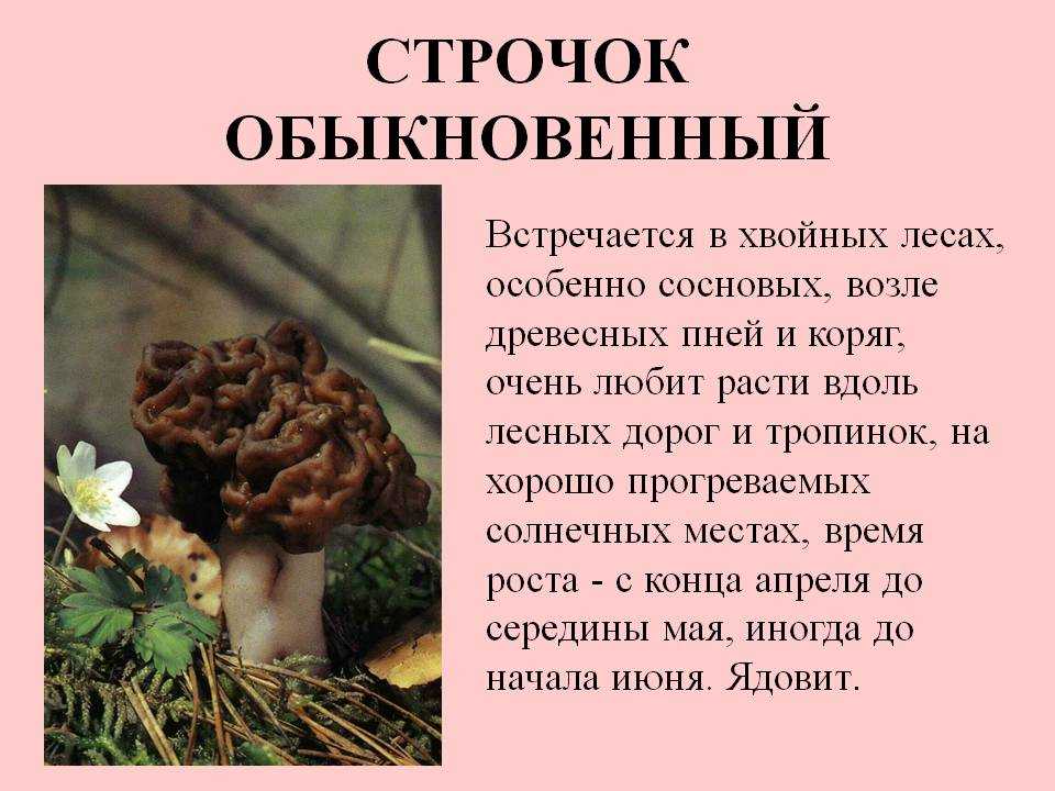 Мест, где растут строчки, намного меньше. Это преимущественно хвойники, сосновые посадки. Время, когда собирать, совпадает со сбором строчков – с начала мая до конца июня. Однако есть еще строчки осенние, у которых время, когда собирать, — с июля по сентябрь, а перечень мест, где растут, немного шире. Такой гриб встречается в лиственных и сосновых лесах, на гнилых деревьях и пнях, в умеренном климате и в Подмосковье.