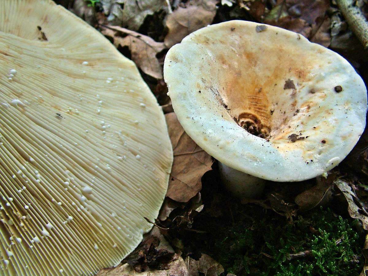 • Пластинки под шляпкой у молочая светло-желтые, а у груздя они белого цвета;