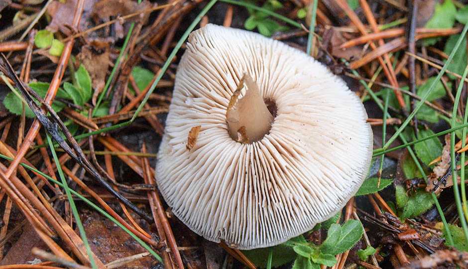- пластины светлые с легким серым оттенком, двух видов. Крупные расположены часто, крепко закреплены в нижней части. Мелкие занимают 1/3 длины, расположены по краю, у взрослых экземпляров выступают за границы плодового тела;