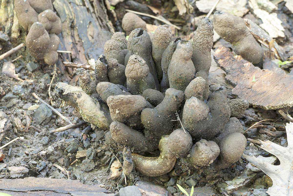 Коричневые пальцы мертвеца, показанные слева, находятся между фазами бесполого и полового размножения этого аскомицетного гриба.