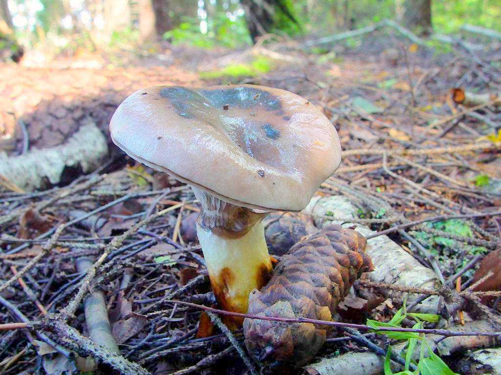 мокруха еловая, которая обладает сероватым оттенком шляпки и растет с елями;