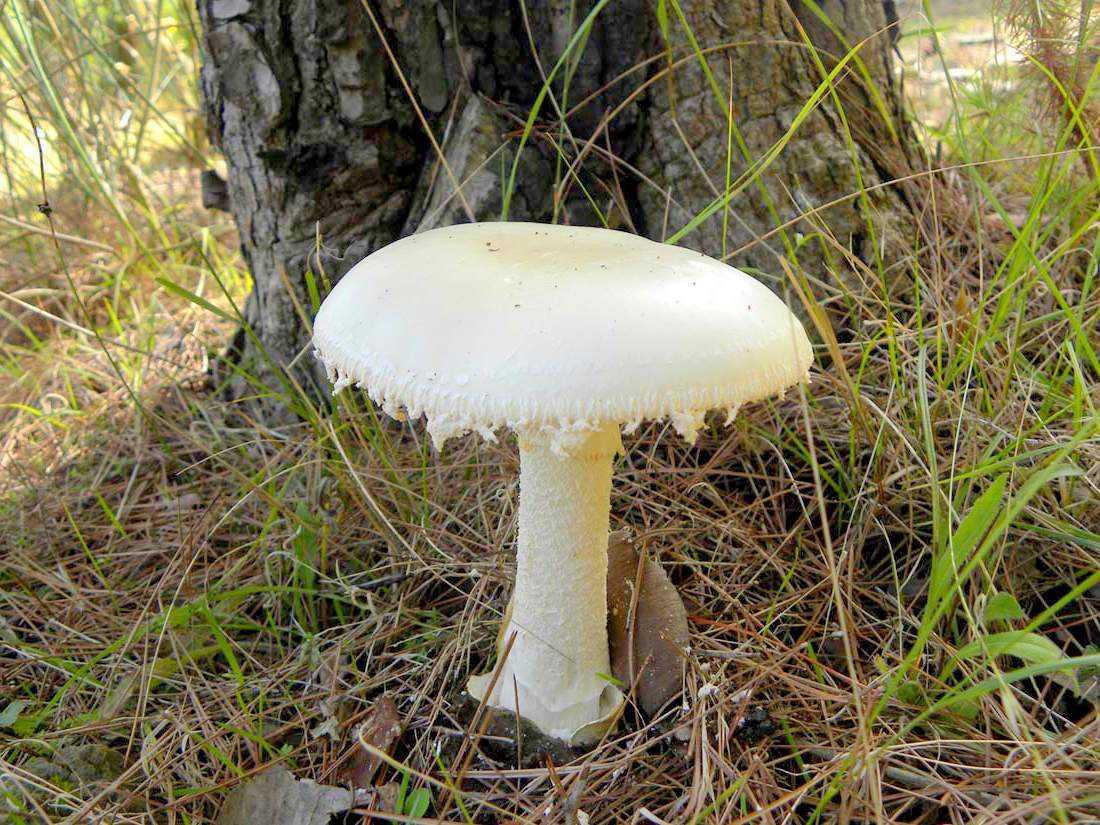 Она же мухомор вонючий. Назван он так не зря. У этого гриба неприятный запах хлора. Диаметр шляпки до 11 см. Цвет белый или грязно-белый. Сухая кожица блестящая, липкая, слизистая.