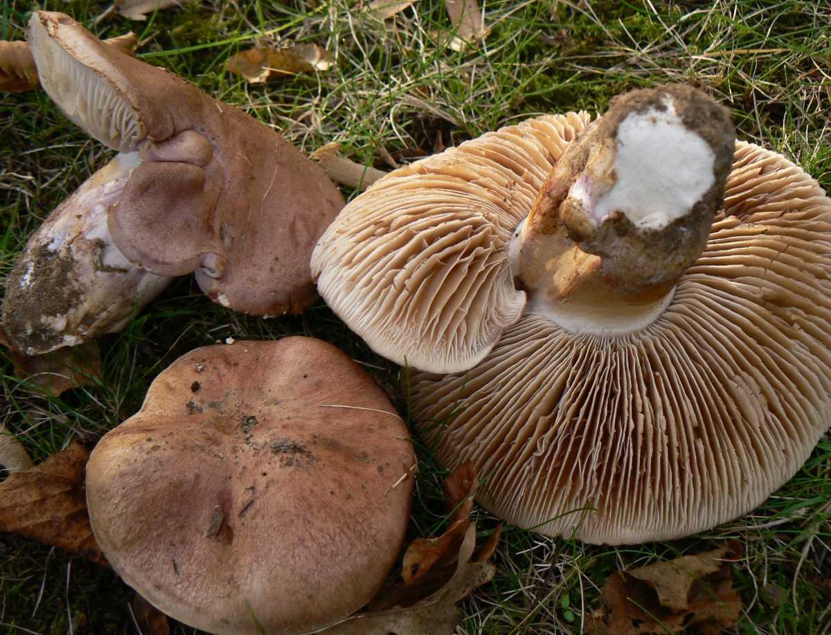 Мякоть беловатая или голубоватая, на разрезе имеет фиолетовые пятна, а у старых грибов становится пурпурной.