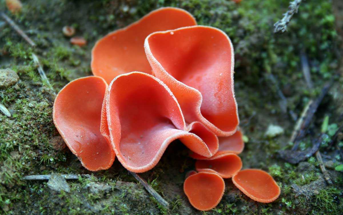 Существуют также похожие на медвежьи ушки грибы под названием алеврия оранжевая. Они тоже относятся к классу съедобных. По форме они сначала напоминают шар, но потом по мере роста они начинают распрямляться, и тогда уже похожи на блюдце с краями, поднятыми вверх. В этой ярко окрашенной чаше собирается постепенно влага, так что такое сравнение вполне справедливо. Описание этих грибов было бы неполным без указания размера. Как правило, диаметр шляпки составляет 2-4 см, как и у медвежьих ушек, но в то же время встречаются и более крупные экземпляры с диаметром шляпки в 10 см. Ножка у гриба короткая и слабо выраженная. Ярко окрашена только внутренняя поверхность чаши, наружная же светлее и покрыта белым пушком. Эти грибы обладают приятным запахом.