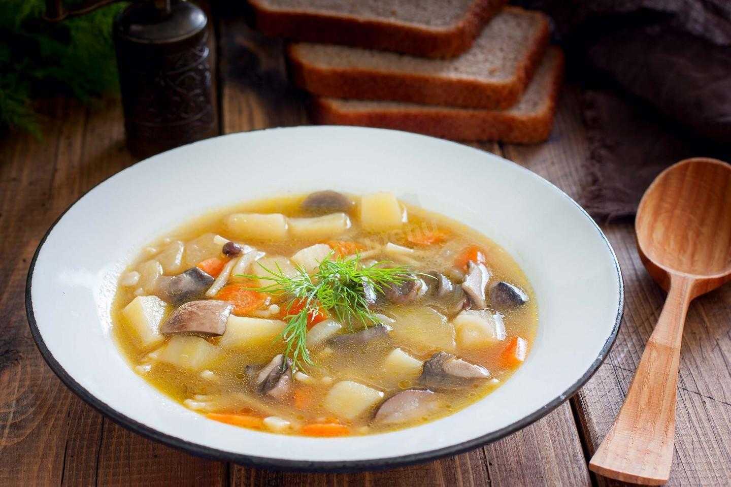 Нарезают морковку и луковицу, обжаривают. То же делают с вареными заранее грибами (250 г). 3 картошины чистят и режут на кубики. Все овощи помещают в кипящую посоленную воду (2 л). Добавляют либо кашу, либо макароны. Специи по вкусу. Посыпают твердым сыром.