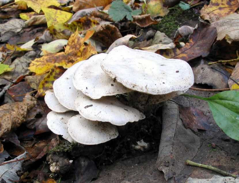 Рядовка гусиная или двухцветная. Гриб кремового или бежевого цвета, плотный с диаметром шляпки максимум 15 сантиметров. Беловатые пластинки под шляпкой довольно часто расположены.