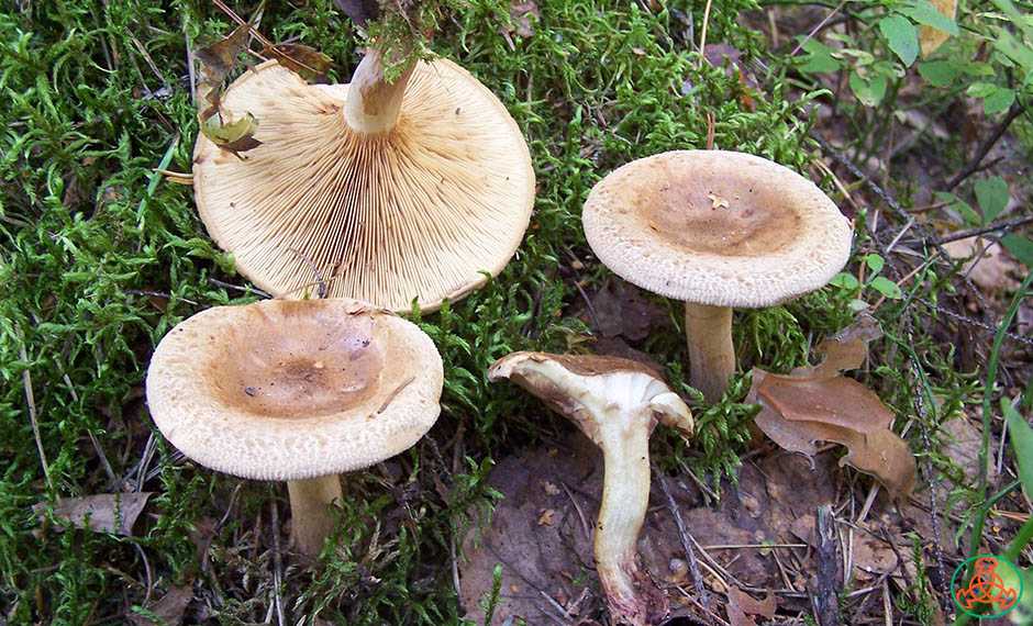 - Вогнутую в центре мясистую шляпку с завернутыми краями бурого с оливковым отливом или серо-коричневого цвета — у молодых и старых представителей соответственно;