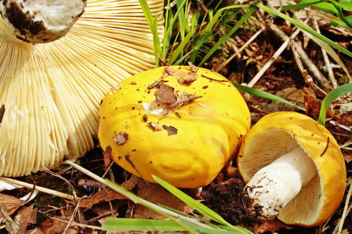 Заметить сыроежку желтую в лесу очень просто благодаря ее ярко-желтой окраске шляпки. Форма шляпки полушаровидная, со временем становится почти плоской, а у старых экземпляров делается воронковидной. Диаметр шляпки сыроежки желтой составляет 5-10 сантиметров.