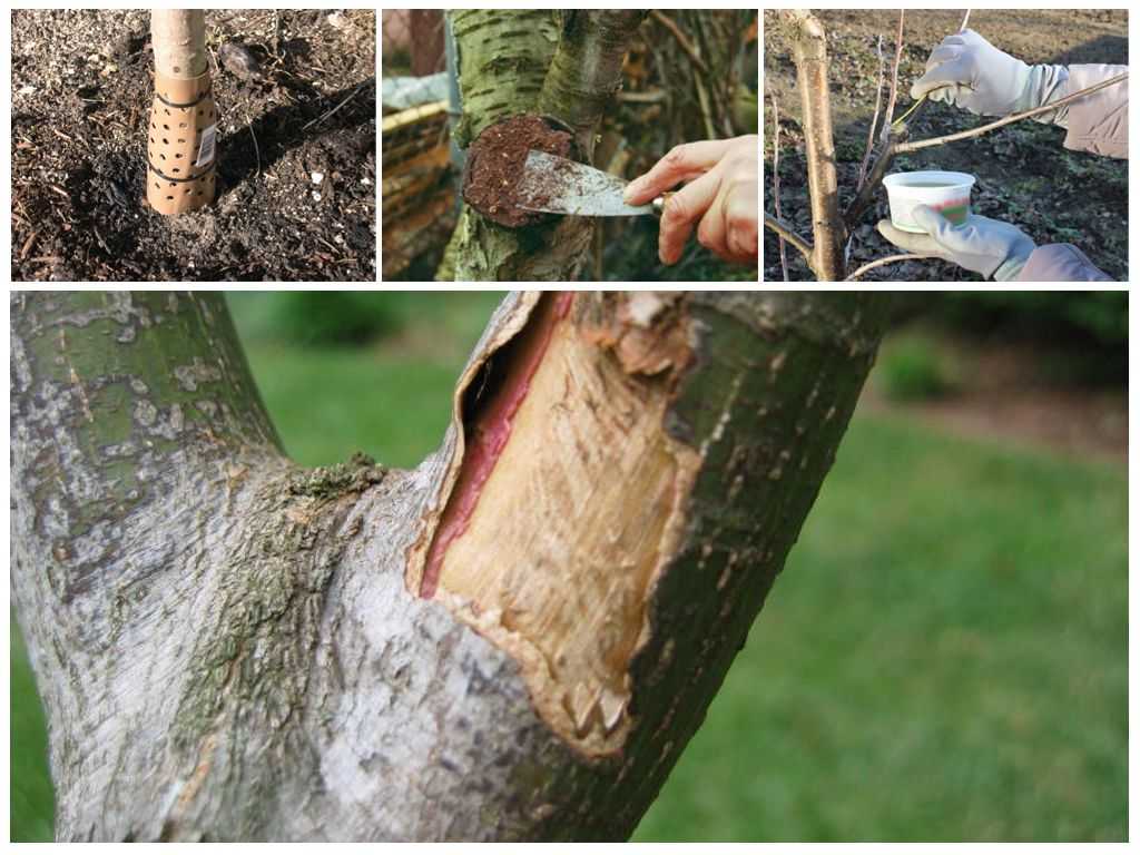 Очень важно не допустить пересыхания коры в месте повреждения, ведь это может привести к болезни или даже гибели дерева. Если мыши нанесли кольцевой вред стволу, когда поврежденная кора снята по стволу, по кругу, то и лечение, должно быть, обеспечено по всему кольцевому повреждению