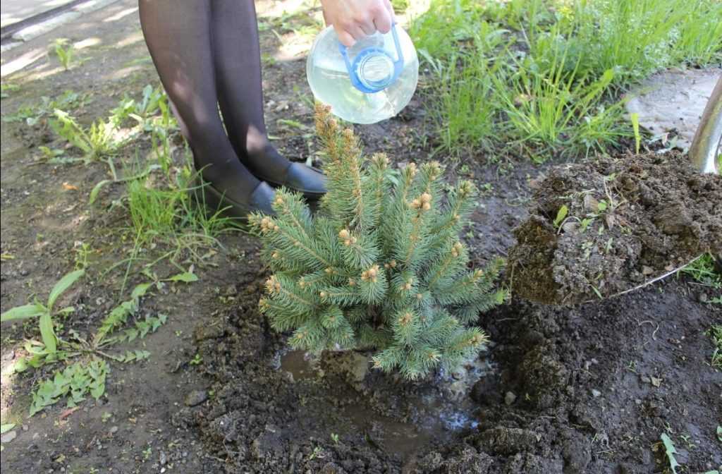 - Обязательно полейте ель сразу после высадки, достаточно вылить под дерево 3-5 л воды.