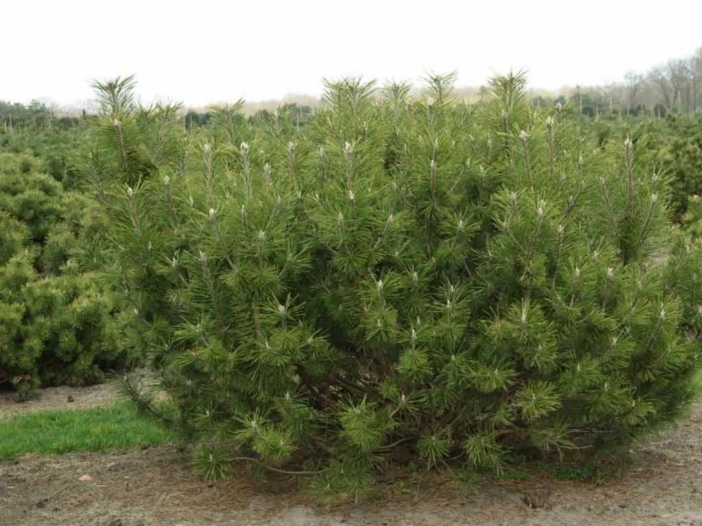 Pinus mugo mughus — что в длину, что в ширину вырастает примерно одинаковых размеров (до 2-3 м), ежегодно прибавляется около 10 см. Иглы посажены густо и собраны в пучки по 2 штуки, каждая из которых достигает 4 см. Шишки начинают образовываться только спустя 6 лет. Во время сильной жары нуждается в регулярном поливе. Растет в любой почве, не привередлива.