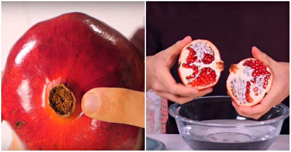 Отрезать верхушку, удалить белые пластинки под ней. Удалить нижнюю часть примерно до уровня, на котором располагаются зерна. Сделать на кожуре 2 надреза, аккуратно поделить плод пополам над миской; часть зерен при этом будет падать в подставленную емкость. Затем оставшиеся удаляются из кожуры с помощью половника. Можно заменить кухонный инструмент столовой ложкой, лучше деревянной.