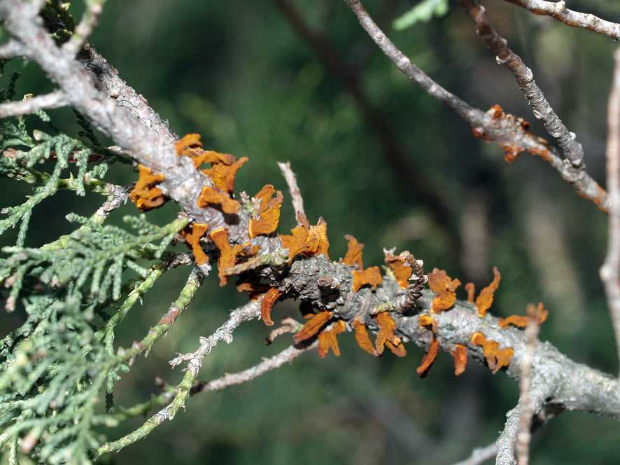 Ржавчина можжевельника – распространённое заболевание. Грибы-возбудители имеют яркий оттенок, прорастают на шишках, хвое, ветках. Кора усыхает, на стволах образуются вздутия;
