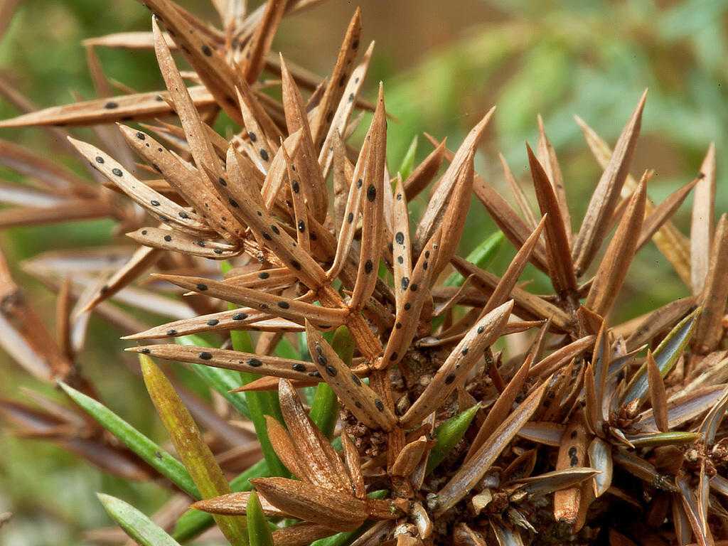 Листья можжевельника редуцированы в заостренную колючую хвою, на ветках хвоинки расположены группами, в мутовках обычно находится 3 штуки. На ветках хвоя живет до 4-х лет.